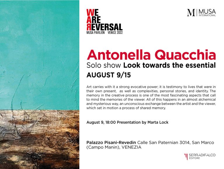 Antonella Quacchia – Sguardo verso l'essenziale (Gaze Toward the Essential) marks the artist's first solo exhibition in Italy, opened with a vernissage on August 9, 2022, in the prestigious Palazzo Pisani-Revedin in Venice. Curated by Francesca Di Trapani and introduced by a critical text by Marta Lock, the exhibition brings together works from the series Our Planet and Floating Thoughts — a visual journey that invites the eye to slow down, to strip away the superfluous, and to rediscover the silent depth of what is truly essential.