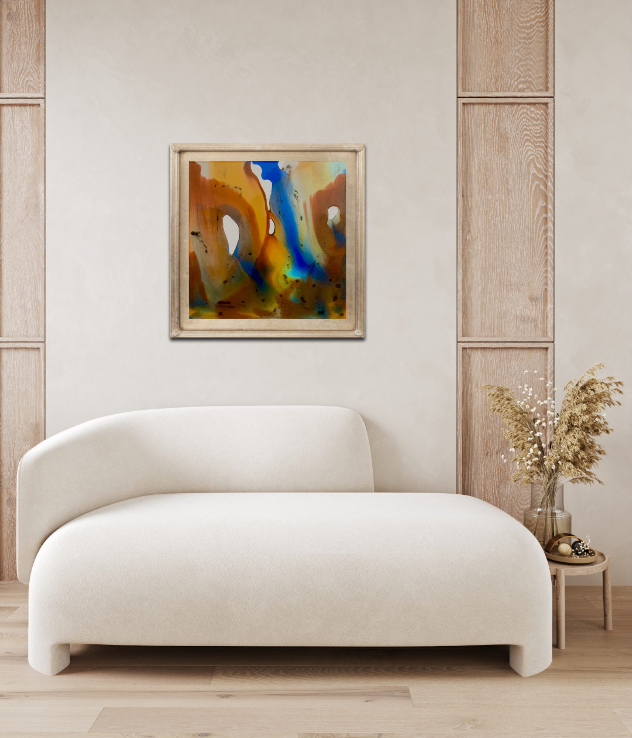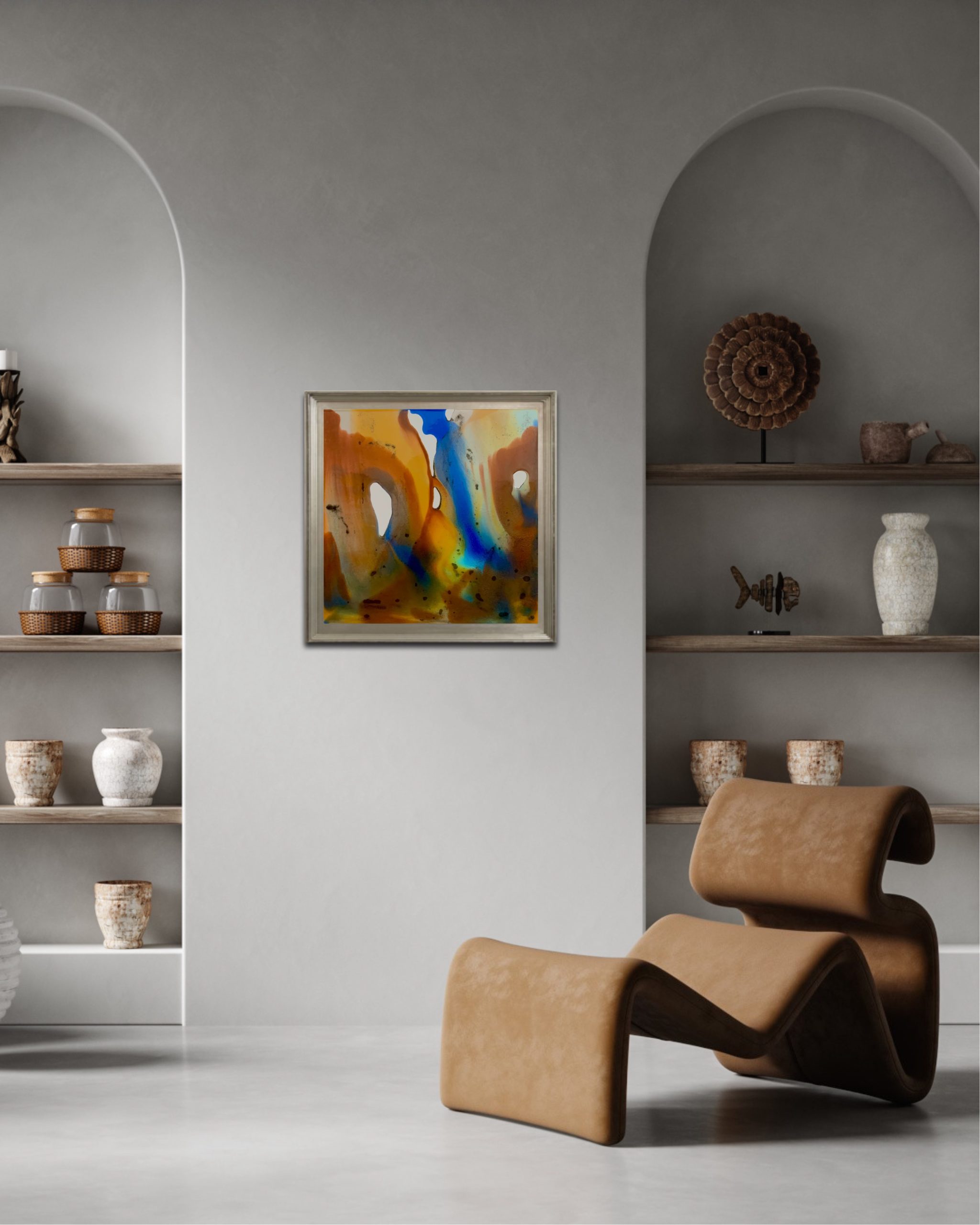 You is a richly atmospheric abstract work from Antonella Quacchia’s Serendipity series, where fluid motion and elemental materials converge to evoke the mystery of natural landscapes. This 50 × 50 cm wood panel combines translucent resin with volcanic black sand, creating a dynamic interplay of texture, color, and depth.